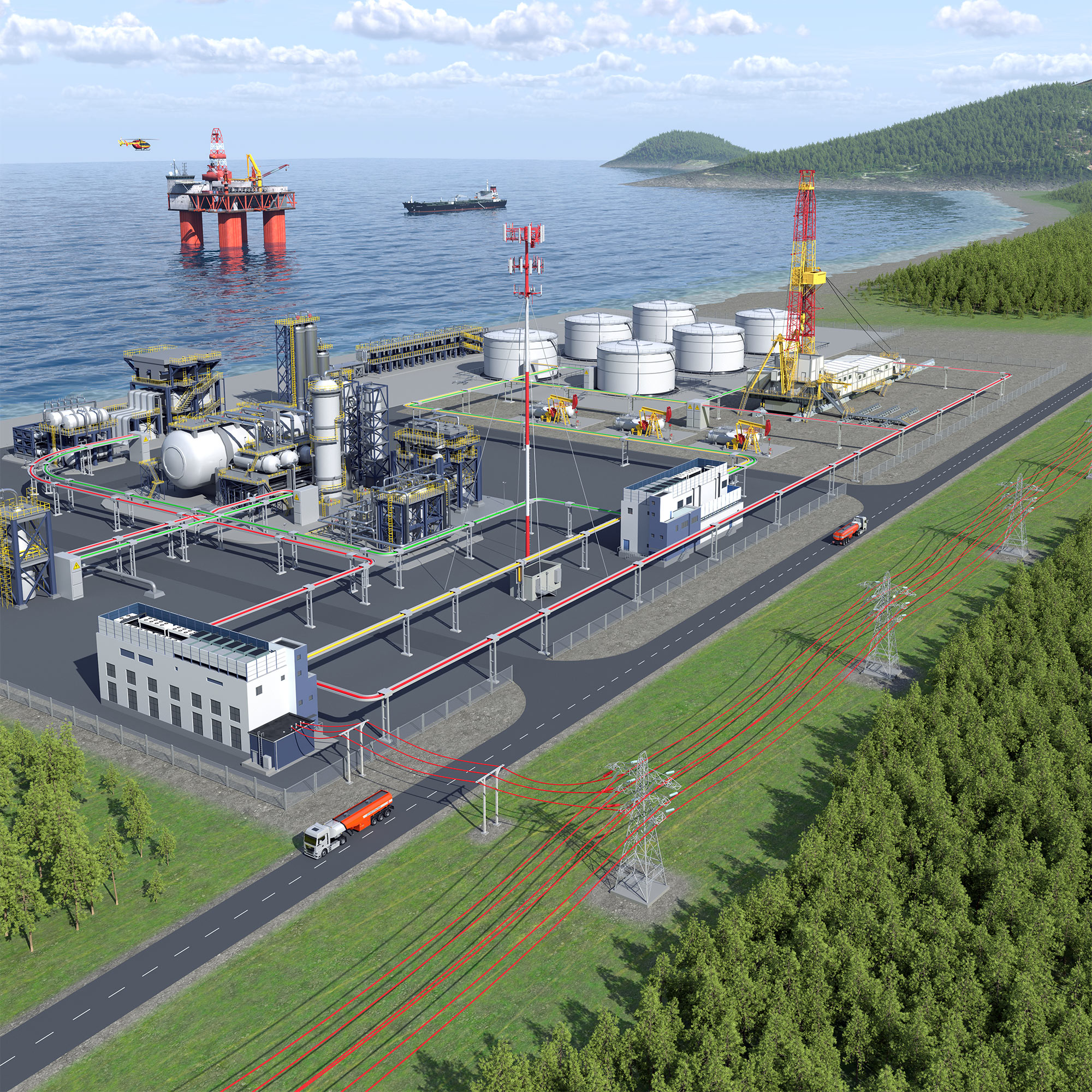 Полная 3D-сцена с установками, резервуарами, ЛЭП, буровыми, трубопроводами, дорогами и морской логистикой - Показали маршруты прокладки кабеля